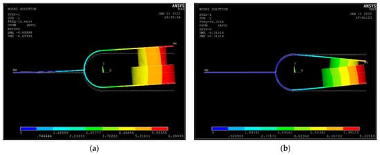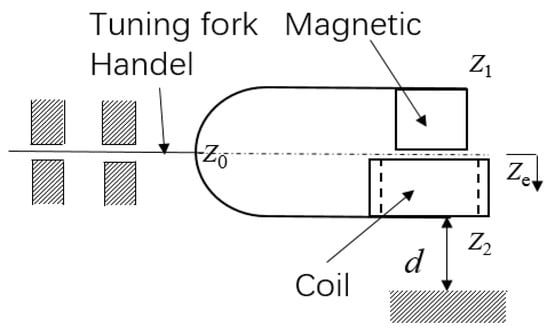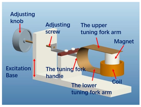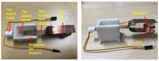 The first equation in Equation (8) is the in-phase vibration mode, and the second equation is the anti-phase vibration mode, where and are the displacement of magnet and coil, respectively, and , is the mass of the end of the magnet or coil, is the damping coefficient of the tuning fork arm structure, is the stiffness of the tuning fork arm, is the adjustable tuning fork handle structural stiffness, is the frequency of excitation, and is the environmental acceleration.