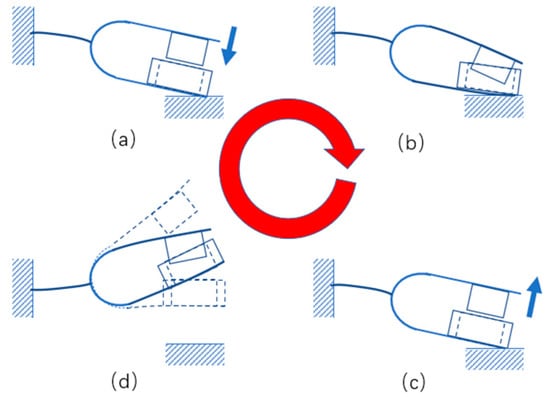 Schematic diagram of the movement process of the electromagnetic tuning fork energy harvester. (a) Impact, (b) maximum deformation, (c) moment of separation after impact and (d) vibration after separation.