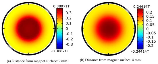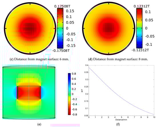 Figure 4a–d are the cloud images of magnetic field at 2, 4, 6 and 8 mm away from the magnet surface, respectively. As the distance increases, the maximum magnetic field intensity decreases from 0.38871 T in Figure 4a to 0.12312 T in Figure 4d. Figure 4e is the magnetic cloud image of the section where the magnet passes through the axis. Although the maximum magnetic field intensity is close to 0.85 T as shown in Figure 4e, the strongest point is inside the magnet. In order to understand the magnetic field in detail, the variation in magnetic field intensity along the axis of the magnet with distance is drawn in Figure 4f.