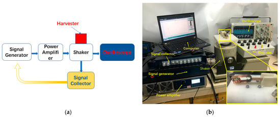 Figure 7 shows the setup for testing the tuning fork energy harvester. This experimental testing equipment forms a closed loop system, which can test the experimental prototype truly and accurately. The control signal of the experimental device is generated by the signal generator, amplified by the power amplifier, and then transmitted to the vibration exciter to control the vibration of the exciter. The signal collector collects the output signal and returns it to the signal generator to calibrate the output signal. The harmonic excitation is used as the input signal of the system. The accelerometer is fixed on the excitation platform to monitor the input vibration of the energy harvester. The oscilloscope is connected to the energy harvester to measure and record the output characteristics of the energy harvester.