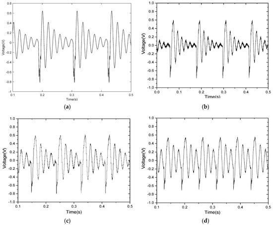 (a) The calculated voltage waveform and (b) the measured instantaneous voltage waveform; ((a,b) are obtained under the condition that L0 = 3.5 cm, impact clearance is 1.0 cm, and acceleration is 0.5 g) (c,d) are experimental results (L0 is 3.0 cm and 2.5 cm, respectively, the spacing is 1.0 cm, and the external load resistance is 25 Ω).