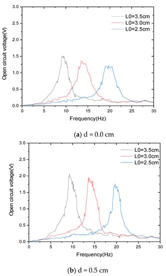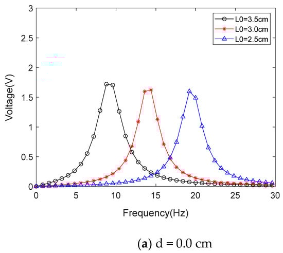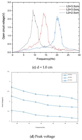 Figure 10 shows the experimental tests of adjusting the tuning fork handle length in a range of 2.5–3.5 cm at different impact spacings. Through frequency sweep experimental tests, it was found that, when adjusting the frequency, the peak output frequency range of the energy harvester was 9.2–21.1 Hz. In this frequency range, the energy harvester can output power in a resonant state. Open circuit voltages are all greater than 1.2 V. Figure 10a shows that the scanning voltage under the impact clearance is 0 cm, and the energy harvester is within the adjustment range (2.5–3.5 cm). With the decrease in the length of the tuning fork handle, the resonant frequency increases and the peak voltage decreases from 1.51 to 1.2 V, which is a slight but not significant decrease. Figure 10b shows that the scanning voltage under the impact clearance is 0.5 cm and the energy harvester is within the adjustment range. The resonant state voltage of the energy harvester has been reduced from 2.16 to 1.75 V. Figure 10c shows that the scanning voltage under the impact clearance is 1.0 cm, and the energy harvester is within the adjustment range (2.5–3.5 cm). The power harvester’s resonant state voltage reduced from 2.57 to 2.2 V, which is again a small drop. Figure 10d shows the change in frequency and peak voltage generated by adjusting L0.