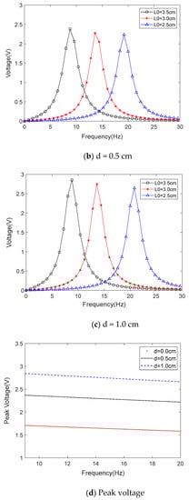 The simulated voltage under various impact gaps (L0 is the length of the tuning fork handle). (a–c) are three sweep curves under certain L0 conditions; (d) is the change in frequency and peak voltage generated by adjusting L0.