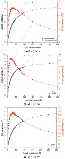 The voltage and power delivered to the different loads ((a) d = 0.0 cm; (b) d = 0.5 cm; (c) d = 1.0 cm) when the length of the tuning fork handle is 3.5 cm.