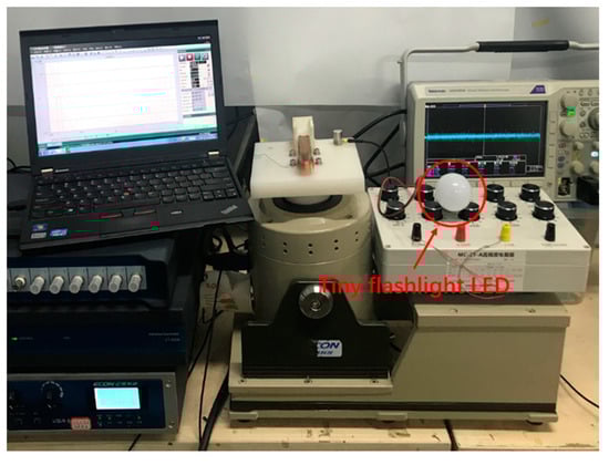 After connecting as shown in Figure 12, under an excitation acceleration of 0.5 g, the impact gap was 1.0 cm, and the excitation frequency was 9.2 Hz. The experimental results are shown in Figure 13. The tuning fork energy harvester can output stably and make a tiny flashlight LED work.