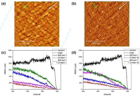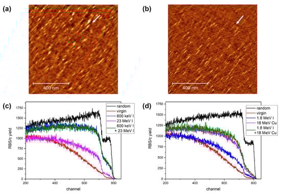 AFM images (1 µm × 1 µm, 1 nm false colour height scale) of ion tracks on Al2O3 surface irradiated with (a) 5 MeV Si and (b) 12 MeV Si ion beams at a grazing incidence angle of 1.5°. The ion beam direction is indicated by an arrow. (c) RBS/c spectra of sequentially irradiated Al2O3 with 600 keV I (1014 ions/cm2) and 23 MeV I (1014 ions/cm2). (d) RBS/c spectra of sequentially irradiated Al2O3 with 1.8 MeV I (3 × 1013 ions/cm2) and 18 MeV Cu (5 × 1013 ions/cm2).