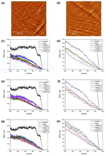 The effects of sequential ion irradiation were investigated using RBS/c, and the results are shown in Figure 1c,d. Low-energy ion irradiation (either 600 keV I or 1.8 MeV I) was used to produce damage in Al2O3 via nuclear stopping. Rather high applied ion fluences (1014 ions/cm2 and 3 × 1013 ions/cm2 for 600 keV I and 1.8 MeV I, respectively) resulted in a moderate amount of damage. Only for the 600 keV I exposure, i.e., the highest applied fluence and the highest nuclear stopping, is the backscattering of protons from aluminium observed, indicating significant disordering of the material. Irradiation with high-energy ions (23 MeV I at a fluence of 1014 ions/cm2 and 18 MeV Cu at a fluence of 5 × 1013 ions/cm2) resulted in the production of point-like defects only, mostly in oxygen sublattice. Both high-energy ion beams have electronic stopping of 9 keV/nm, which is supposed to be below the threshold for ion track formation, which is at 10 keV/nm [,,]. Therefore, these ion beams should be excellent for the observation of defect annealing via electronic stopping. However, the results presented here suggest that this is not the case. Neither the annealing of defects nor the increased sensitivity of damaged material to ion track formation was observed.