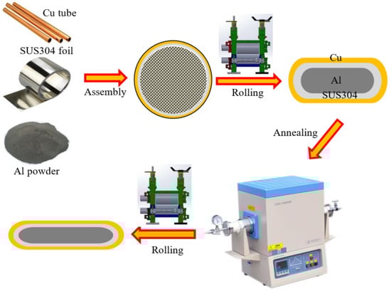 Schematic illustration of the preparation process of Cu/Al clad sheets with SUS304 interlayer.