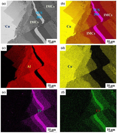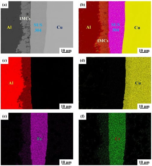 When the intermediate annealing temperature increases to 550 °C, obvious IMCs with an average thickness of 10 μm are formed at the bonding interface of the SUS304 interlayer and Al matrix [18], as shown in Figure 3a, which is also strongly proved by the corresponding EDS mapping results (Figure 3b). A small increase in the annealing temperature may result in a significant increment in the diffusion coefficient [19] due to their exponential relationship (Figure 3c). In contrast, the chemical compound type formed between the SUS304 interlayer and Cu matrix [20] is the solid solution (Figure 3d). The position of the SUS304 interlayer is marked by the distribution of Fe and Cr elements (Figure 3e,f). For Cu/Al clad sheets without an interlayer, the Cu-Al IMCs are broken into fragments in the rolling process [6]. Nevertheless, the IMCs formed between the SUS304 interlayer and Al matrix can retain their continuity. The existence of an SUS304 interlayer with a weak deformation capacity can significantly inhibit the crush of Al-SUS304 IMCs and enhance the interfacial bonding strength.