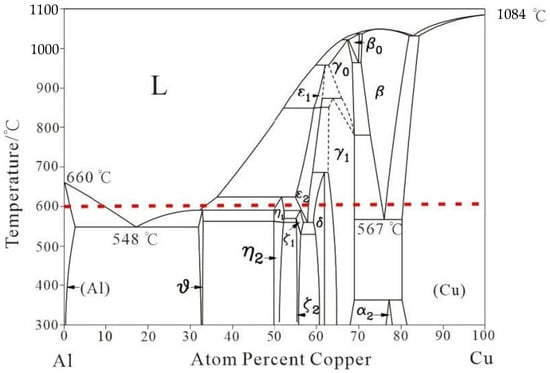 The interfacial microstructure of IFR-600 is exhibited in Figure 4. As the intermediate annealing temperature reaches 600 °C, the clear Cu/SUS304/Al interface disappears and is replaced by the chaotic composite interfaces (Figure 4a). According to the Al-Cu phase diagram (Figure 5), the liquid phase will be formed at the bonding interface with the annealing temperature of 600 °C (red line in Figure 5). In this case, the Cu/SUS304/Al interface is destroyed by the disturbing force induced from the formation process of the liquid phase, resulting in the exfoliation of SUS304 fragments from the Cu matrix and being involved in the liquid phases. Due to the relatively high annealing temperature, the diffusional degree of IFR-600 is much larger than those in IFR-450 and IFR-550 (Figure 2 and Figure 3), which is also proven by our prior research [21]. Based on the EDS mapping results (Figure 4b–d), it can be observed that the SUS304 fragments are surrounded by thick Cu-Al IMCs. The position of the SUS304 interlayer is marked by the distribution of Fe and Cr elements (Figure 4e,f). Moreover, the hardness of Cu-Al IMCs is higher than the Cu/Al matrix, leading to the increase in the thickness reduction of the SUS304 interlayer in the further cold rolling process. For IFR-600, the residual thickness of the SUS304 interlayer is just 5.9 μm, around a third of those in IFR-450 and IFR-550.