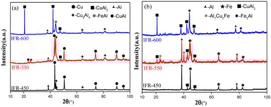 The XRD patterns of the peeling surface of IFR samples are provided in Figure 7. It can be seen that the intermediate annealing temperature has a significant impact on the type and content of crystalline phases on the peeling surface. The main crystalline phases in the peeling surface of the Cu side for IFR-450 and IFR-550 are Cu, Al, Cu9Al4, and CuAl2. The interfacial elemental diffusion is enhanced by the increase in the intermediate annealing temperature, resulting in the increment of Cu-Al IMCs, especially the Cu9Al4 phase (Figure 7a). In addition to the Al, Fe, CuAl2 phases, a new Al7Cu2Fe phase is observed at the Al side of IFR-550 (Figure 7b). As the intermediate annealing temperature reaches 600 °C, the main crystalline phases in the peeling surface of the Cu side for IFR-600 are transformed into CuAl2, Al, Cu9Al4, and FeAl. As to the Al side of IFR-600, the main crystalline phases are CuAl2, Fe3Al, and Al.
