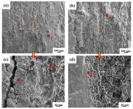 The morphologies of the peeling surface for IFR-600 and the chemical compositions of corresponding crystalline phases are shown in Figure 10 and Table 3. The main crystalline phases on the peeling surface of the Cu side for IFR-600 are the CuAl2 phase with a coarse surface and the vitreous FeAl phase (Figure 10a,c). Compared with IFR-450 and IFR-550, the Cu matrix is undetectable for IFR-600, which implies the transformation of the crack propagation path from the initial Cu/SUS304 interface to the Cu-Al IMCs and Fe-Al IMCs layers. High intermediate annealing temperature results in the formation of an unduly thick IMCs layer and Kirkendall voids, which promotes crack propagation and reduces the interfacial bonding interface [23,24]. Similarly, the SUS304 fragments cannot be observed on the peeling surface of the Al side, only some castle peaks of the CuAl2 phase and rock-like Fe3Al phase (Figure 10b,d). Furthermore, the reticular Al matrix also disappears. The above results also prove that the interfacial cracks are propagated along the Cu-Al IMCs and Fe-Al IMCs layer and the bonding strength of the Al matrix is higher than these IMCs.