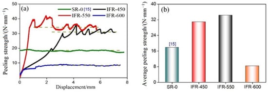 Figure 11 shows the peeling strength curves and average peeling strength of the Cu/Al clad sheets with the SUS304 interlayer annealed at different temperatures. To highlight the strengthening effect of the SUS304 interlayer, the peeling curve of the clad sheets without the SUS304 interlayer (SR-0) is also introduced. With the increase in the intermediate annealing temperature, the peeling strength of the clad sheets firstly increase and then decrease (Figure 10a). Compared with IFR-450, the peeling strength of IFR-550 is increased by 11%, from 30.9 N/mm to 34.3 N/mm. Moreover, the fluctuation of the peeling strength curve for IFR-550 is larger than that of IFR-450, indicating the difference in the bonding strength among the SUS304/Cu interface, Cu-Al IMCs layer, and Al matrix being enlarged.