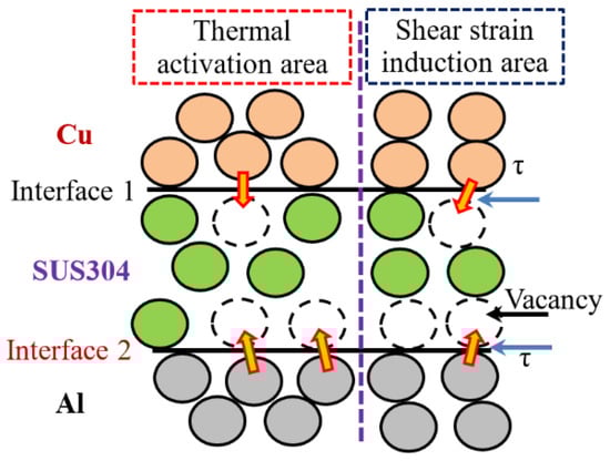 The diffusion process across the bonding interface of Cu/Al clad sheets has been verified to conform to the vacancy diffusion [26]. The energy input for interfacial atomic diffusion from two aspects: one is the thermal energy from the intermediate annealing treatment; the other is the shear strain energy provided by the ductility difference between the SUS304 interlayer and Cu/Al matrix, as shown in Figure 12. Our previous research has indicated that increasing the thickness of the SUS304 interlayer can improve the interfacial bonding strength by enlarging the shear strain energy at the bonding interface [15]. In this study, the interfacial atomic diffusion, as well as the interfacial bonding strength, is enhanced by raising the intermediate annealing temperature. While for IFR-600, the peeling strength sharply decreases to 8.3 N/mm, which is even lower than the clad sheets without the SUS304 interlayer, as shown in Figure 11. A high intermediate annealing temperature leads to the formation of unduly thick IMCs layers, which promote the crack propagation and decrease the interfacial bonding strength.