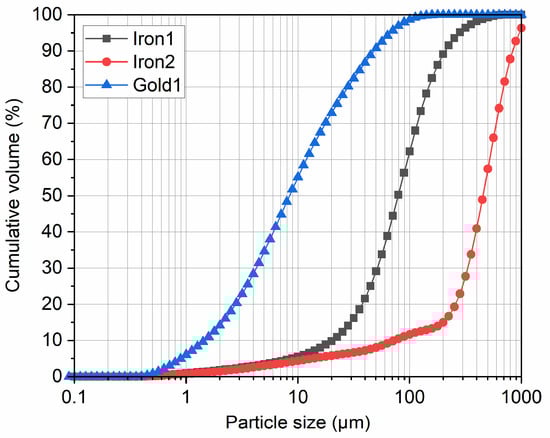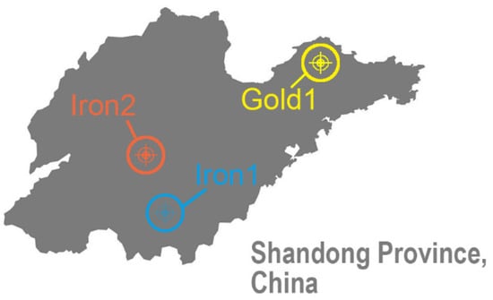 There were three types of tailings with different physical and mechanical properties used for the sample preparation, named as “Iron1”, “Iron2”, and “Gold1”. As shown in Figure 1, the three types of tailings used in this study were sampled from an iron mine in central Shandong Province, an iron mine in southern Shandong Province, and a gold mine in the northeastern Shandong Province, respectively.
