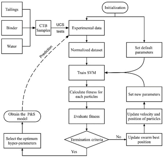 Two machine learning algorithms were used for predicting the UCS values of CTB. Support vector machine (SVM) was used as the predicting model and the radial basis kernel function (RBF) was determined to be the kernel function for SVM. SVM has lots of advantages when used for prediction and regression analysis, such as very little overfitting and effectiveness in high dimensional spaces [,,,,]. However, the hyperparameters of SVM were very hard to tune manually, and the hyperparameters could determine the accuracy of the prediction model. Therefore, particle swarm optimization (PSO) was used to tune the hyperparameters for SVM. PSO is a nature-inspired optimization algorithm which was first built up by Kennedy and Eberhart []. It us a very effective optimization algorithm that has been used in many cases [,,,,]. Introduction of the principles of PSO and SVM can be found in the previous study [].
