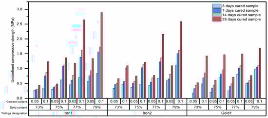The UCS values of CTB samples in this study are shown in Figure 4. It can be seen that the UCS increased with the increase of curing age. The CTB sample with a higher cement content had a higher UCS at the same curing age. These findings are likely to be related to the increased curing age and cement content leading to the formation of an increasing amount of cement hydration []. These results were consistent with the previous researches [,]. However, as there was no obvious law between the tailings type and the UCS value, it was hard to conclude or describe the effects of tailings type on the UCS of CTB by preliminary observation.
