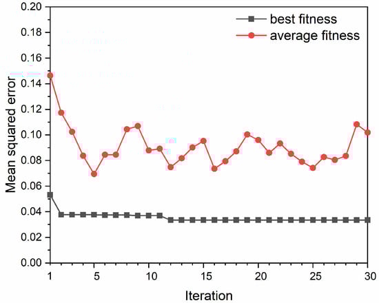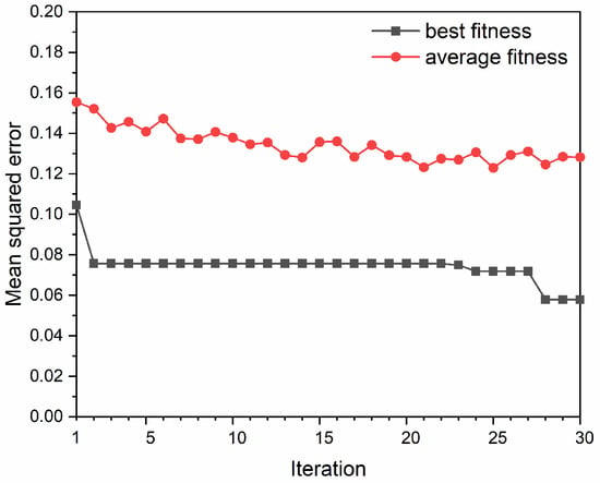 The fitness curves are shown in Figure 5. It can be seen that the best fitness decreased from 0.1046 to 0.0757 at the second iteration, and then kept constant until the 22nd iteration. After that, the best fitness decreased slightly and then kept nearly at 0.0578. It can also be seen that the average fitness showed a decrease trend before the 20th iteration, and then kept nearly at a constant. According to the tuning results, the optimal hyperparameters for the SVM prediction model were C = 78.349, = 0.0001, and = 0.595.