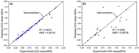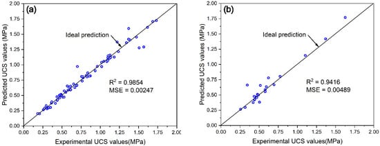 Based on the obtained hyperparameters, the P&S model was trained on the training set and tested on the test set. The prediction results and verification results are shown in Figure 9. It can be seen from Figure 10a that the model performed well in the training set. A high R2 value of 0.9854 and a good MSE value of 0.00247 were achieved and most prediction data were almost equal to the experimental data. It can also be seen from Figure 10b that the data points were concentrated near the ideal prediction line, and a high R2 value of 0.9416 and a good MSE value of 0.00489 were achieved. This indicated that the model had been trained well and achieved high accuracy on both the training set and the test set. The categorized randomly segmentation may be a suitable way to train the model for predicting the UCS of different types of tailings backfill materials.
