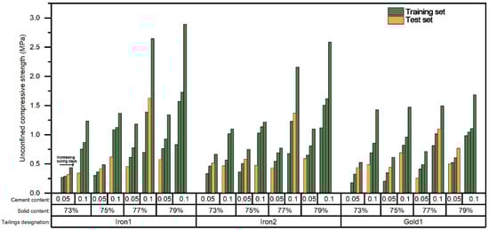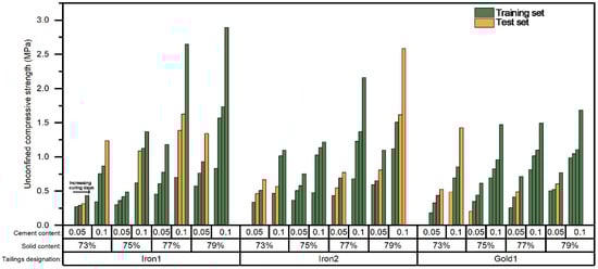 The P&S model was aimed to predict the UCS value of different tailings. Since the dataset was composed of three different types of tailings experimental data, the whole dataset was first segmented into three subsets according to the classification of the tailings. Then each of the subsets was segmented into two subsets with a size ratio of 8:2 randomly to be the training set and test set. Figure 8 shows the details of the training set and test set based on the categorized randomly segmented dataset. It can be seen that the data of the training set and the test set achieved a uniform distribution in each type of tailings.