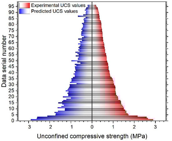 After the well trained P&S model was obtained, the whole experimental data were used to test the capability of the P&S model on the UCS prediction. Figure 11 intuitively shows the comparison between the experimental UCS values obtained from the unconfined compression test and the UCS values predicted by the trained P&S model. On the right half of Figure 11, the experimental UCS data are arranged in descending order from the largest to the smallest. The predicted UCS data on the left half of the figure correspond to the experimental data on the right half of the figure. It can be seen that most predicted UCS values were similar to the experimental UCS values. The shape consisting of the predicted and experimental UCS value bars is basically symmetrical. The R2 value was 0.97 and the MSE value was 0.0044, which indicated a high prediction accuracy of the P&S model. The whole computation time for the prediction work was 4 s, using MATLAB 2017a on a personal computer with Intel Core i5 processor. This indicates the high efficiency of the P&S model.