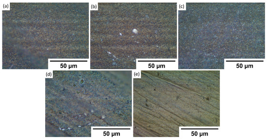 Microscope pictures, with ×50 magnification of each sample groove texture. (a)—17-4PH stainless steel, (b)—PH13 stainless steel, (c)—Ti6Al4V titanium, (d)—2024 T3 aluminum, and (e)—7050 aluminum.