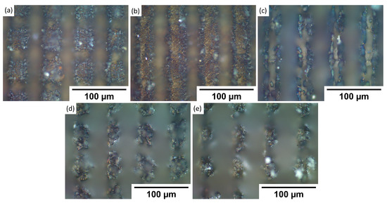 Microscope pictures, with ×100 magnification, of each sample LIPSS texture. (a)—17-4PH stainless steel, (b)—PH13 stainless steel, (c)—Ti6Al4V titanium, (d)—2024 T3 aluminum, and (e)—7050 aluminum.