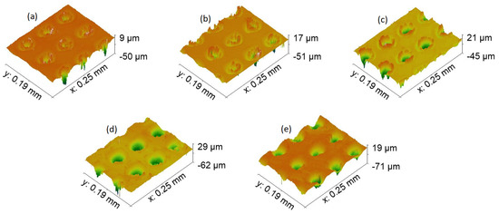 The next step was to compare topography in terms of the profile of formed features in Figure 6, Figure 7, Figure 8 and Figure 9. First, let us compare dimples in Figure 6. Their total depth is in the range from 59 μm for 7-4PH stainless steel to 91 μm with 2024 T3 aluminum. Dimples proved to be the deepest modification compared with LIPPS (which, as expected, were the shallowest), grooves, and pillars. Furthermore, both aluminum samples have dimples that are relatively deeper than steel or titanium. Aluminum samples also have substantially cleaner sides of the profile, while for harder materials some residue material is visible along the sides of the cut. This can be explained by the softer nature of aluminum, allowing easier removal of the material using a laser. A similar trend continued for all the other topographies. Interestingly, a potentially higher degree of residue material left after cutting also resulted in the pillars of PH13 in Figure 9a to be partially transformed back to grooves. However, the overall depth was still significantly different from the grooves of the same material (58 μm grooves vs. 32 μm pillars). Nevertheless, these differences seem to not have a direct correlation with wettability, neither in the short-term, nor long term. Thus, this clearly shows that while general surface topography can help in inducing wettability, it cannot achieve the required result alone.