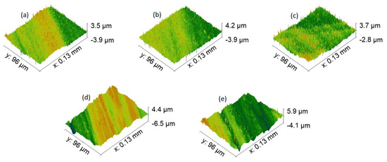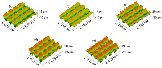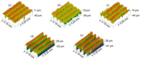 Topography, with ×100 magnification of each sample LIPSS texture. (a)—17-4PH stainless steel, (b)—PH13 stainless steel, (c)—Ti6Al4V titanium, (d)—2024 T3 aluminum, and (e)—7050 aluminum.