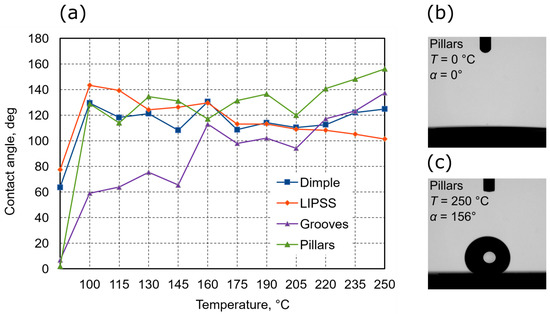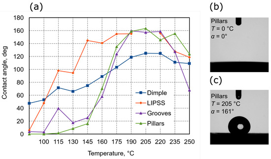 (a)—The contact angle of different patterns on steel surface dependence heat treatment in different temperatures. (b,c)—the lowest and highest acquired contact angle and temperatures needed to induce it.