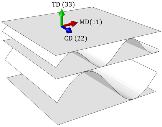 Corrugated cardboard is highly orthotropic, mainly due to the fact that it is a fibrous material. Its mechanical properties depend on the orientation of the fibers in the corrugated cardboard layers. Most fibers run along the paper web, which is called the machine direction (MD). The second main direction is the direction perpendicular to the MD, called the cross direction (CD), see Figure 1. Corrugated cardboard, because of its fiber orientation, is stiffer along the wave direction. Weaker mechanical properties in the CD are compensated by the take-up factor of the corrugated layers.
