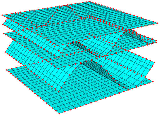 The transformation matrix, , allows relating the generalized displacements to the generalized strains in external nodes of the RVE model. Details on the derivation of the transformation matrix can be found in [33] for the Kirchhoff–Love theory and in [45] for Reissner–Minding plates. Considering the elastic strain energy equation: