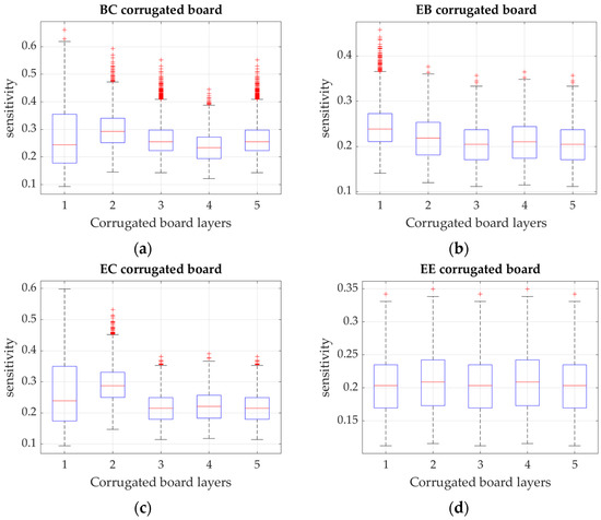 In Figure 5, the sensitivity of ECT to the change in grammage of the cardboard layers is presented. The median values are marked by red horizontal lines, and the bottom and top blue edges of the box indicate the 25th and 75th percentiles, respectively. The whiskers extend to the most extreme data points not considered outliers, and the outliers are plotted individually using the ‘+’ marker symbol.