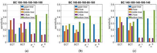 Average sensitivity of ECT, , and BCT of all boxes in relation to the layer grammage perturbation for BC cardboard of selected grades: (a) 100-160-100-160-100, (b) 160-80-160-80-160, and (c) 140-100-140-100-140.