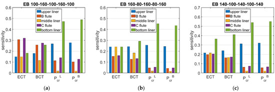 Average sensitivity of ECT, , and BCT of all boxes in relation to the layer grammage perturbation for EB cardboard of selected grades: (a) 100-160-100-160-100, (b) 160-80-160-80-160, and (c) 140-100-140-100-140.