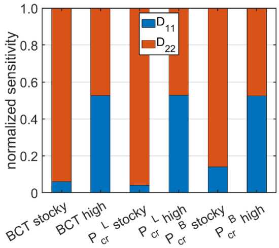 Figure 8 presents the participation of the bending stiffnesses and in the sensitivity of BCT and . The results are shown for the BC corrugated cardboard with a grade of 100-160-100-160-100. The proportions for the remaining cases are similar; therefore, the results are shown only for cardboard of one grade.