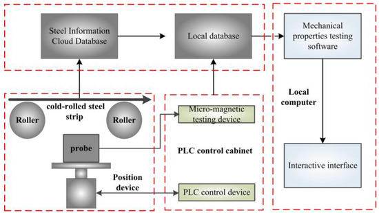 As shown in Figure 1, the online micro-magnetic testing system for the mechanical properties of cold-rolled steel strips is divided into a hardware part and a software part, which is embedded after the hot dip galvanizing process of the cold-rolled steel strips. The workflow of the entire detection system and the role of its components can be explained as follows. Firstly, when the cold-rolled steel strips are running, rollers are used to minimize vibration and keep lift-off stable. Secondly, a probe is placed in a suitable position through a PLC control and position device, which can also send the signal of the lift-off between the probe and cold-rolled steel strips to a local database (LD). Thirdly, cold-rolled steel strips can be locally magnetized by the probe, which is a methodical combination of multiple micro-magnetic NDT techniques (TMF, BN, IP, EC) [1], as shown in Figure 2. Moreover, four kinds of original signals are picked up by ➆ and ➇, and processed by a micro-magnetic testing device. In the meantime, 41 electromagnetic characteristics, used to reflect the mechanical properties of cold-rolled steel strips, are stored in the LD. Fourthly, corresponding mechanical properties of cold-rolled steel strips are stored in the Steel Information Cloud Database (SICD). The LD obtains the corresponding mechanical properties in the SICD through Network Interface. All data (position signals, 41 electromagnetic characteristics, mechanical properties, etc.) are integrated into the LD, with the storage format as shown in Table 1. Finally, through Network Interface, integrated data are called by mechanical properties testing software (MPTS), which will automatically split data into training and validation sets and, then, built-in model training sets to target properties (Rm, Rp0.2, A).
