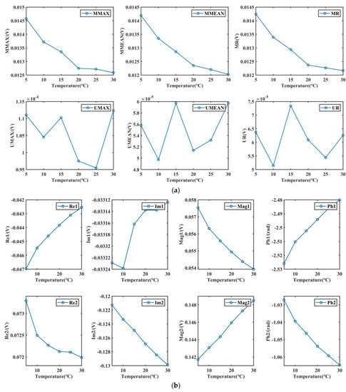 Figure 3 illustrates the trend of electromagnetic characteristics with temperature. As the temperature increases, the BN characteristics (MMAX, MMEAN, MR) monotonically decrease, while the corresponding IP characteristics are irregular. The EC characteristics almost all show a monotonic change with temperature. The different responses to the temperature of the detection methods imply different physical principles.