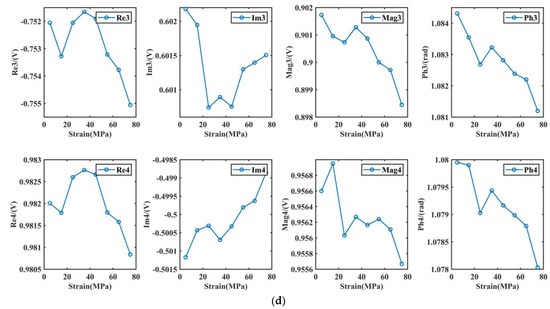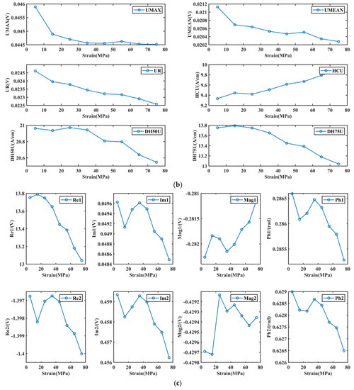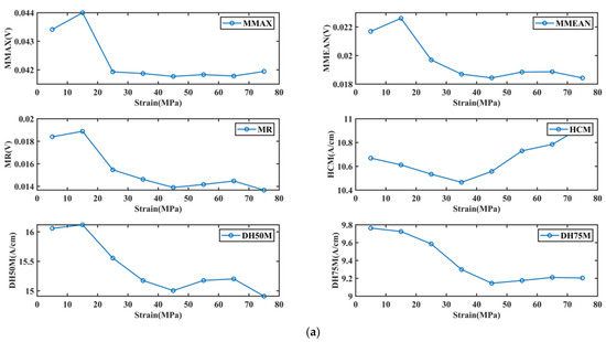 Similar to the BN method, the EC also shows a phased change in the range of 5–35 MPa. This is because the external stress interacts with the internal stress of the lattice, causing electrical conductivity and effective permeability to respond differently to the result of their action. However, when it exceeds 35 MPa, the principal stress direction is external stress direction, and with the increase in pearlite elastic deformation, dislocation density increases, which increases the obstruction to phonons, so the thermal conductivity and electrical conductivity decrease. At the same time, the effective permeability is also decreasing. So, almost all EC characteristics show monotonicity variation within 35–75 MPa.