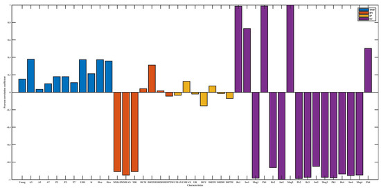 The Pearson’s correlation coefficient signs between some characteristics and the influencing factors may be opposite, for example, the correlation coefficient of Re1 is opposite to that of temperature and tension, indicating that the influencing factors affect the magnetization state of materials from different mechanisms. Temperature can change the internal stress state to lower the domain pinning threshold. In the process of increasing tension to yield limit, the principal direction of stress and dislocation density will be changed, and the domain motion will be affected.