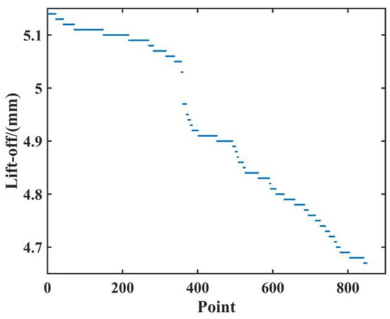 In the process of field data investigation, we found that the tension and temperature of the same batch of steel coils are often altered within a tiny range. For example, the tension ranges from 23 MPa to 27 MPa, and the temperature of the cold-rolled steel strip is almost constant from quarter to quarter. Figure 8 shows the lift-off variation of approximately 100 coils of the same cold-rolled steel strip (each volume represented by 5–10 pieces of data). We can conclude that the fluctuation range is (4.67, 5.13) mm. Based on the results of the lift-off experiment, the electromagnetic features extracted would be affected. In order to obtain more accurate test results, it is necessary to compensate for the lift.