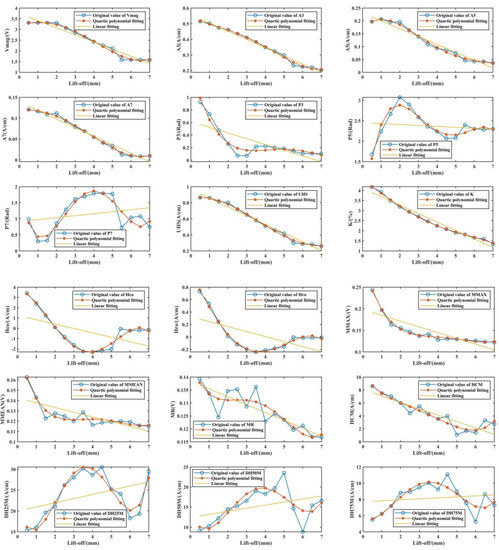 The least-squares method is a common method to deal with the curve-fitting problem, which is used in the regression of 41 electromagnetic parameters to achieve a pseudo static detection state. The results of linear fitting and quartic polynomial fitting are shown in Figure 9. The higher the Pearson’s correlation coefficient, the closer the result of the linear fitting is to the true distribution of electromagnetic characteristics. However, for the quartic polynomial fitting, it seems that it is not bound by Pearson’s correlation coefficient. In particular, when fitting moderate and low correlation characteristics (P5, P7, MR, DH25M, etc.), the results are closer to the real trend. Hence, the quartic polynomial fitting is emphasized in the lift-off regression.