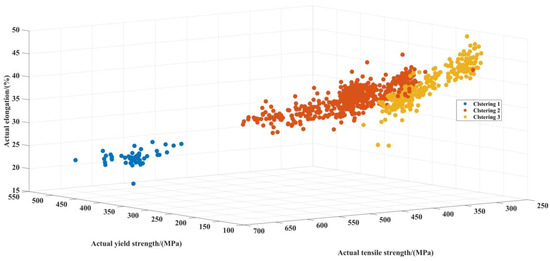 In the process of cluster analysis, 24 kinds of cold-rolled steel strips, a total of 4800 sample data, are divided into 3 categories. Initially, the cold-rolled strip number 27,383, a total of 200 pieces, was marked. After cluster analysis, target data were divided into 3 clusters, a total of 1665 strips, which were composed of 13 kinds of cold-rolled steel strips. Cold-rolled strips with more than 150 pieces were removed, and 7 kinds of cold-rolled steel strips, a total of 1281 pieces, were retained after reprocessing. The results obtained by GMM is shown in Figure 11.