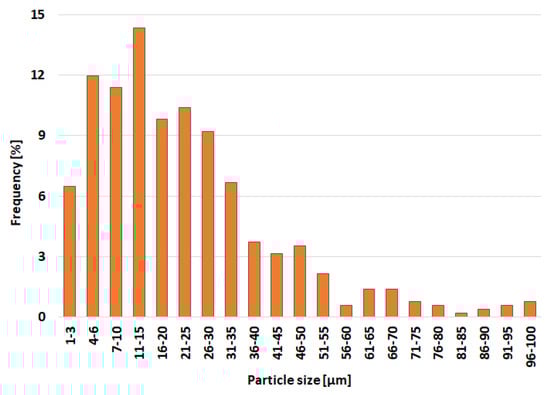 The pure metals were mixed with a composition of 25 wt.% Nb, 4 wt.% Ta, 8 wt.% Sn, and the rest was Ti. Metals were melted, and the prepared alloy was subsequently gas-atomized. The morphology of the atomized powder particles is shown in Figure 1. The particle size of the atomized powder was determined from SEM images by image analysis. At least 500 particles were measured, and the distribution of the particle size of the initial powder is shown in Figure 2.