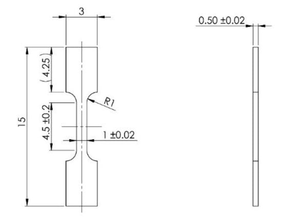 The microhardness of the material was measured using a microhardness tester FUTURE TECH FM-700 (FUTURE-TECH CORP., Kawasaki, Japan), with a load of 1 kg. Compressive and tensile tests were performed to determine the mechanical properties. For the implementation of mechanical compression tests, 3 samples in the shape of a square-based block with dimensions of a = 3.3 mm and h = 4.7 mm were prepared. Compression tests were carried out using the universal testing machine LabTest 5.250SP1-VM (LaborTech, s.r.o., Opava, Czech Republic) at the temperature of 25 °C. The strain rate for the compression test was 0.001 s−1. For tensile tests, bone-shaped microsamples, with dimensions shown in Figure 3, were prepared from the sintered tablet. The tests were performed on a Tira tester with a constant speed of 0.0675 mm/min at a temperature of 25 °C.