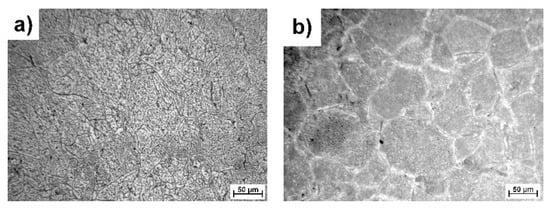Microstructure of Ti-25Nb-4Ta-8Sn alloy prepared by SPS (a) and after heat treatment (b) (optical microscope).
