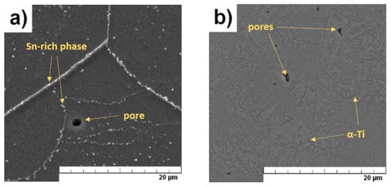 Vickers microhardness of the SPS sample reached 293 ± 5 HV 1. After annealing, the microhardness only slightly increased to 305 ± 2 HV 1 (Table 2). Due to the precipitation of the fine α-Ti phase during annealing (Figure 9) and lower porosity, the alloy was slightly strengthened despite the grain coarsening. Furthermore, solid solution strengthening may play a role due to the dissolution of the Sn-rich phase.
