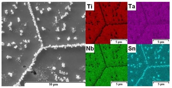 EDS analysis (elemental mapping images) revealed that the precipitated phases in SPS material were rich in Sn (Figure 6). Due to the size of the phases (<1 µm) and the signal-generating area of the SEM–EDS (2–3 µm), more detailed point analysis was influenced by signals from the surroundings of the phases. Bartáková et al. [19] studied the Ti-25Nb-4Ta-8Sn alloy prepared by arc melting process, followed by hot forging (700–1100 °C) and solution treatment (850 °C/0.5 h/furnace cooled). In the microstructure, they observed only β-Ti grains with a very small fraction of α-Ti phase, especially along the grain boundaries. No Sn-rich phase was detected in their study.