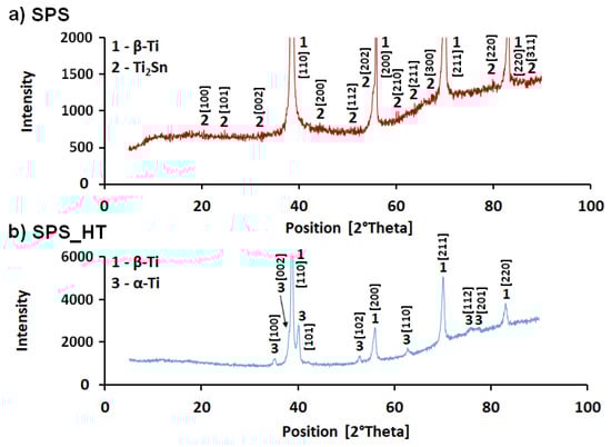 X-ray diffraction analysis of the SPS sample proved the presence of β-Ti phase (BCC, a = b = c = 0.329 nm) in the alloy, and the phase containing Sn was identified as Ti2Sn phase with hexagonal crystal lattice (a = b = 0.474 nm and c = 0.563 nm), as shown in Figure 7. Since the β-Ti phase was dominant in the structure, the peaks of the Ti2Sn phase showed a very low intensity. The Ti2Sn phase was revealed by a more detailed examination of the measured data in the X’Pert HighScore program. The presence of this phase was also indicated by EDS analysis, which showed the content of 71.7 ± 2.8 at. % Ti and 28.3 ± 2.8 at. % Sn in the analyzed particles. Slightly higher content of Ti was caused by the surrounding Ti matrix and small dimensions of Ti2Sn particles.