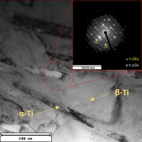 Detailed microstructure of SPS_HT sample with needle-like α-Ti phase in β-Ti matrix (TEM).
